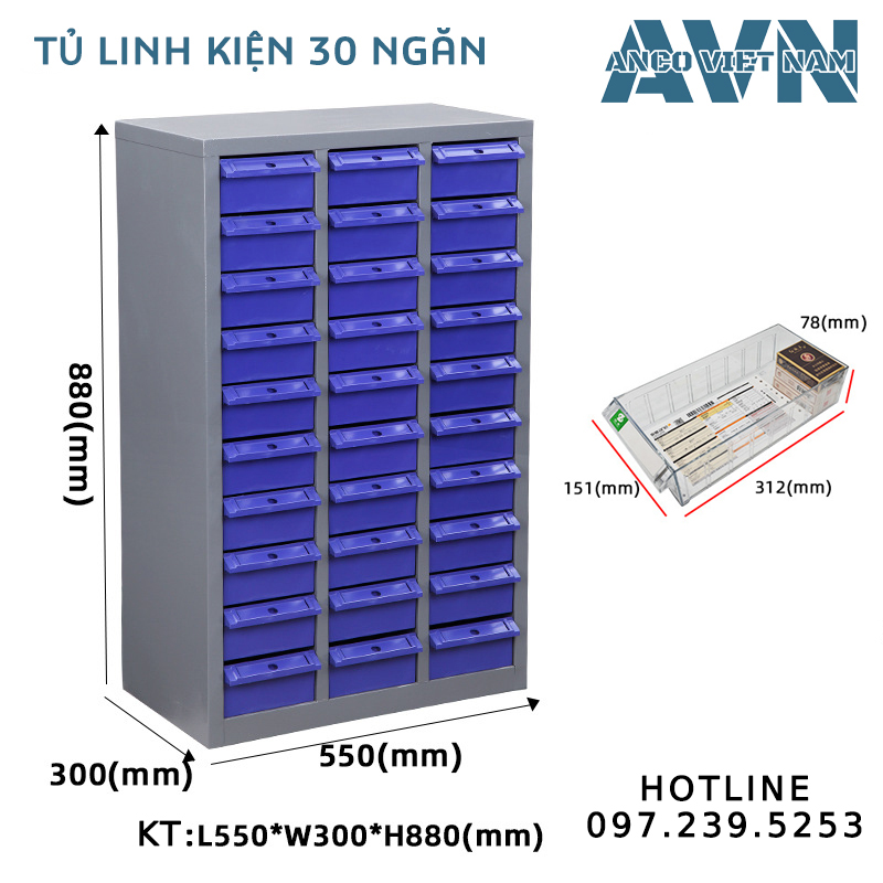 - 30 ngăn chứa lớn: Với số lượng ngăn lớn, tủ chứa khay giúp phân chia và lưu trữ nhiều loại linh kiện, phụ tùng khác nhau mà không lo bị lộn xộn hay thiếu chỗ.